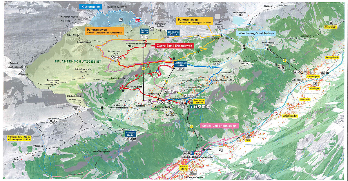 Braunwald周辺のパノラマ地図はこんな感じ。一段高くなっている所の真ん中にBraunwaldがあります。そこから谷を迂回して左端、Nussbüel(ヌスビュール)へ向かいます。