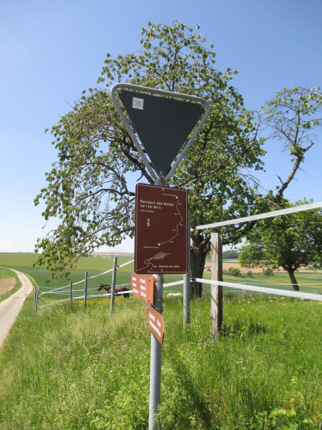 茶色の表示板は「麦の道」です。黄色の表示板の公式ハイキング道とは別の(かぶってる部分も多い)地方が整備している道で、麦畑をはじめとする畑作地帯のGros-de-Vaudで見つけました。