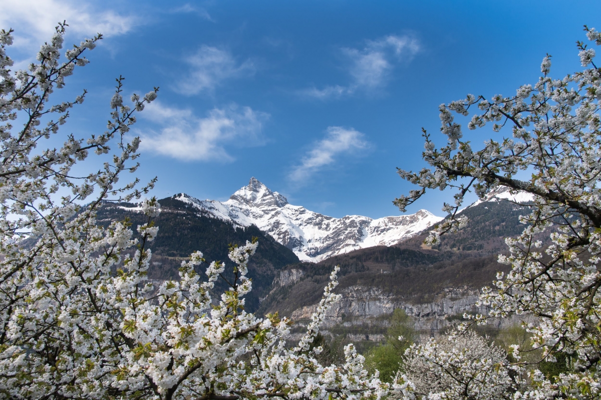 南西側。尖がってる頂は、Aigle辺りでは真っすぐ横に7つのピークが並んでたDents du Midiの東側のピーク、Cime de l’Est(3179m)。