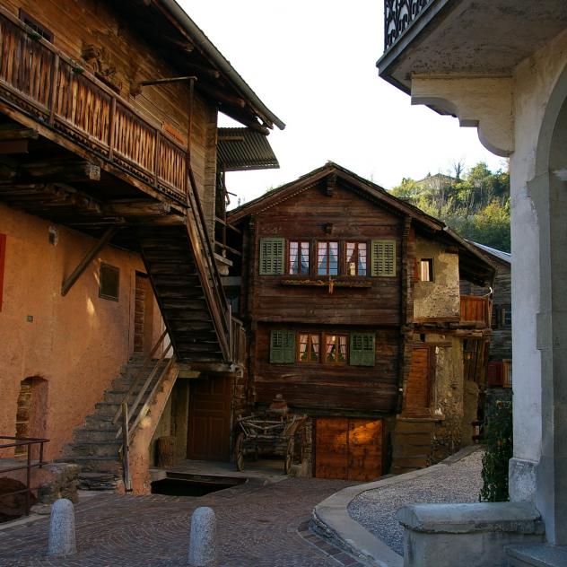 さらに奥に入っていくと、家々が小路を挟んでぎゅっと密集しています。Anniviers谷の人々は山間部の谷に畑、牧草地、森林、山小屋を、平地にブドウ畑、菜園、果樹園を所有。畑を耕し、家畜の世話をして、ブドウを栽培。家の裏側には彼らの家庭菜園が残っているそうです。