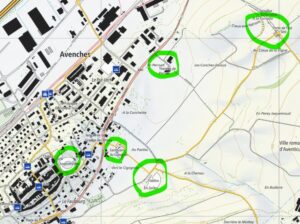 Avenchesは駅(左上)から坂道を上って行くと古くからの街並みが残る旧市街(左下)。緑で囲んだのが遺跡なのですが、旧市街のすぐ横に、