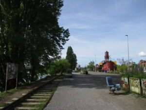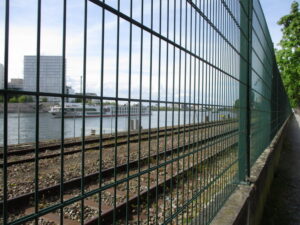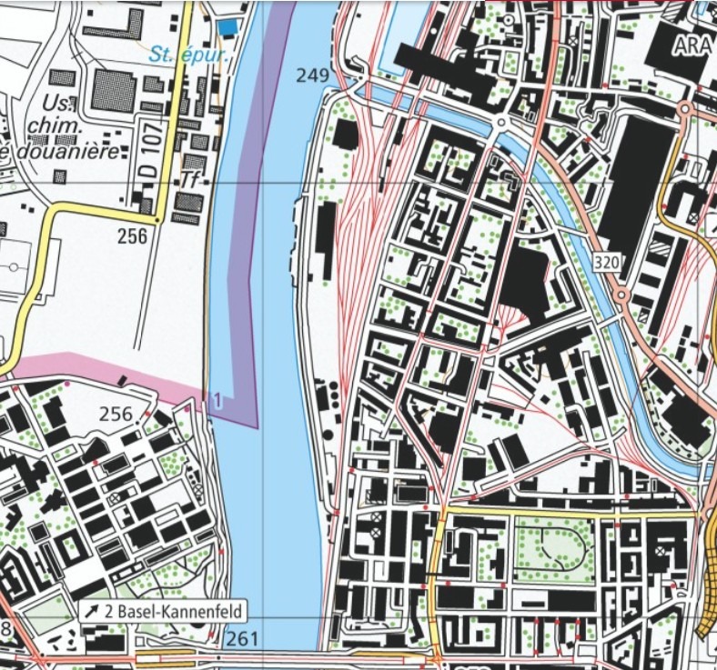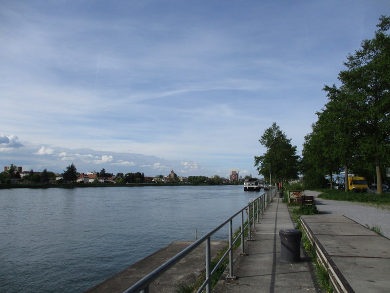 そして、線路の横を歩くようになった辺りから、対岸はスイスからフランスに代わりました。地図上で、ライン川の真ん中に薄紫の太線が通っている部分。