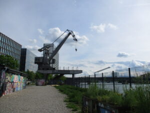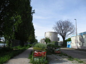 湾岸や川辺の工業地帯にアート系のイベント会場を設ける試み、住宅地と離れた場所なら夜遅くまで騒いでも問題ではないだろうし。工業地帯ではありますが、反対側は川がゆったりと流れ、散歩や自転車やジョギングの人が通る、気持ちの良い道でした。
