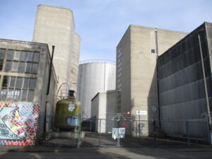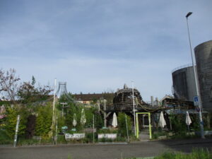 パラソルが並んでいる所を見ると、天気の良い日にはレストランのテラス席として人で一杯になるのでしょう。キッチュな感じの装飾が隣の巨大タンクとの妙な対比ですがアーティストが集う場でもあるようで、