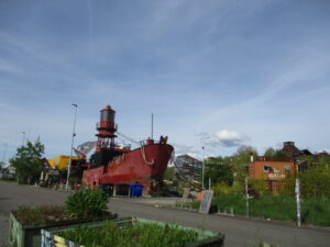 劇場、コンサートや食事が楽しめるイベントスペースHorzpark Klybeck。船の名はGANNET。元々は1950年代に建造され、アイルランド沖で灯台船として停泊してたのが、2010年より売りに出され、スイスに運ばれ2020年より船の中がレストランとコンサートスペースに改装されました。