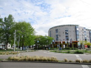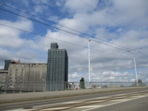 下を別の道路と運河か川が通っている上を通過すると前方に国境検問所が見えてきました。現在は止められることはありませんが(路面電車がそのまま通るくらいだし)係の人はいた気がする。左奥の大きな建物はショッピングセンターで、検問所で税金の返還手続きをしている人もいました。