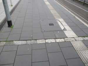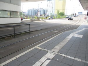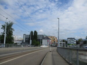 トラムの線路の横に歩道と車道。スイス側を振り返ったところ。道路が高くなっているのは下にある水辺を越える橋になっているため。