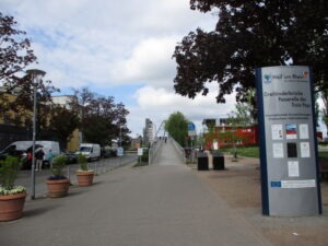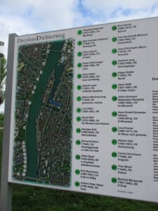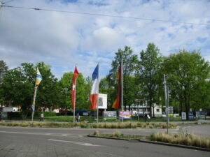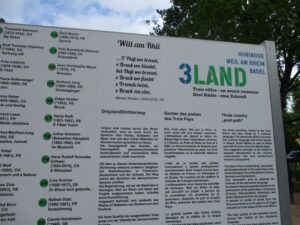 Huningue(仏)、Weil-am-Rhein(Wiil am Rhii 独)、Basel(スイス)の3Land。「Trois villes, Dreistädte=3つの「町」、「eine Zukunft, un avenir commun」=一つの未来。中世より、アルザス、バーデン大公国南部、バーゼルでは同じドイツ語方言を用いてきた。「詩人の道」には3国、27名の詩人の詩の一節が掲げられているおり、この地の方言の豊かさ、力強さを味わえる。ライン川で繋がった同じ言葉!