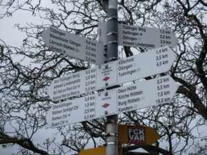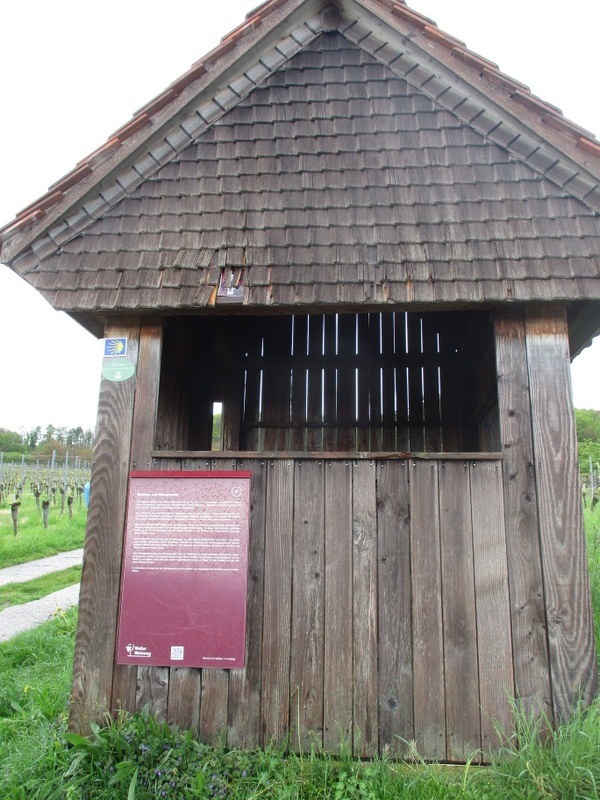 ハイキング表示板ですが、Otlingenからは赤の菱形の中に黄色のブドウが描かれているマーク、ロングトレイルMarkgräfler Wiiwegli(winetrail ワインの道)の印が付いてきます。全長92キロ、Freibourg – Staufen – Müllheim – Blansingh – Weil am Rheinまでの5行程の道をちょっと歩きました。92㎞なんてドイツという大きな国のほんの一部。Markgräfler Wiiwegliにつなげてまた別のワインの道が菱形の色を変えて続いています。