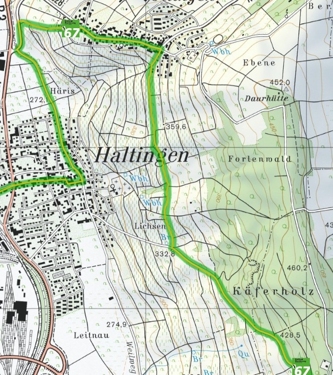 ÖtlingenからTüllinger Bergを歩きます。最高標高が452mの南北に細長い丘で西側のWeil am Rheinと東側のLörrachを隔てる丘。