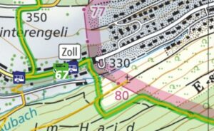 Riehenのバス停(左上の赤矢印)から緑の太線を歩いて国境線上にある47番の国境石を見て、そこから南へ。右下にあるZoll(国境検問所)に向かいます。