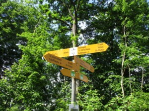 Im Haid (340m) 緑の太線と黄色の線のハイキング道が交差するところ。先ほどのZollのすぐ近く。 67番のDreiland-Wanderwegは直進ですが、左手の隠れてる表示はInzlingen Dorf(ドイツ)。東へ進むとドイツとの国境を経てIntrigenの町まで30分。