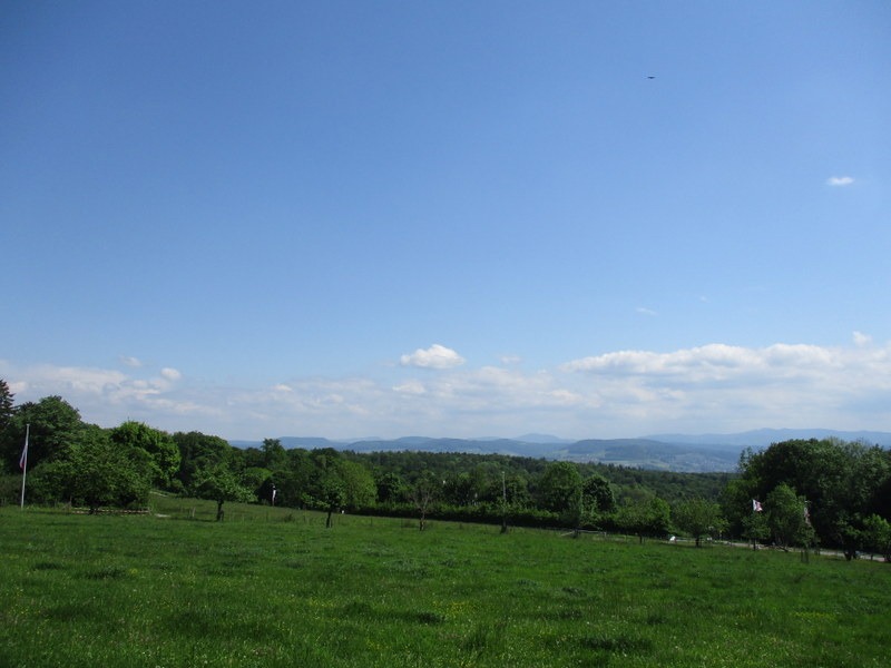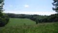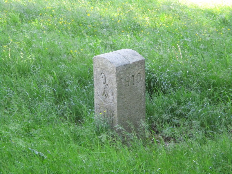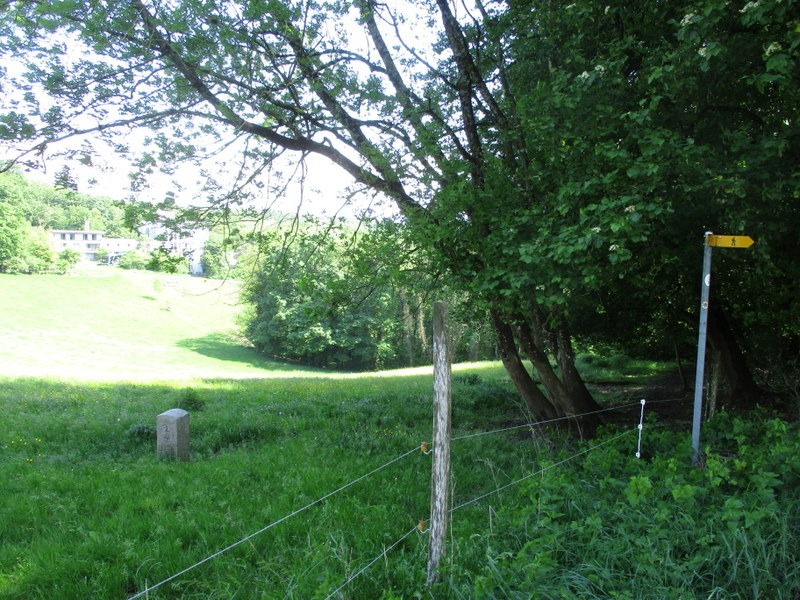 黄色のハイキング表示板が示す道の曲がりのすぐ脇に国境石発見!この柵は人を排するというより家畜放牧用の柵(牛などが外に出ないようにするための柵)で、国境とは関係ないので越えても良い柵ですが、既に十分国境石を堪能した後なので、遠くから眺めるだけにしました