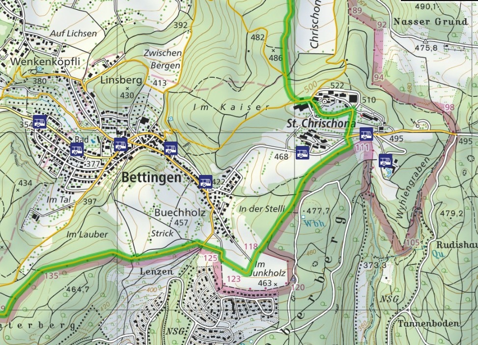 1833年にBasel(バーゼル)州はStadtとLandschaftの2つの準州に分離します。BettingenはBasel-Stadt(都市)に属する唯一のrural、自然に囲まれた自治体。それというのは1627年にBettingenが「都市部」であるRiehenと、独立した自治体ではあるものの「融合」した関係になったからのようです。「融合」はしても、BettingenとRiehen、わざわざ境界石を置くくらいだから、ちょっと複雑な関係なのかしら~