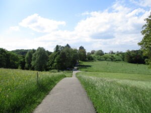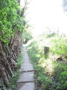 左側の生垣のすぐ横を通る小道。これが国境線に当たるようで、道のすぐ右に国境石。