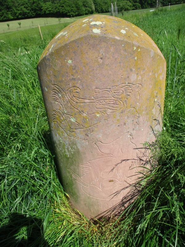 反対側には舌を突き出した怪物、に見える。2002年の設置なので流石にバーデン大公国関連じゃないよなあ。国境の向こう側の現在のドイツではGrenzach-Wyhlen市で紋章は立ち姿勢で舌を出してる熊なのでそれかとも思うが、一方広域の行政区分ではBaden-Wüttembergに属し、ここの紋章は三頭のライオン(舌を出してる)。熊、ライオン、どちらにもそんなに似てない・・・長いしっぽがふさふさだし。ご存じの方がいたらご教授願いたいです。