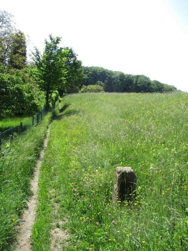左側の生垣のすぐ横を通る小道。これが国境線に当たるようで、道のすぐ右に国境石。