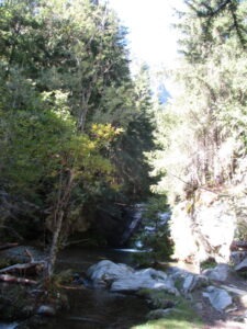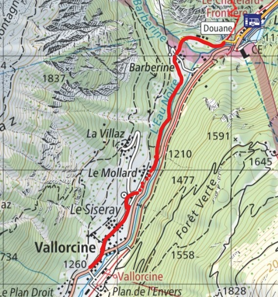 地図の右上端から赤色の線で表された険しい山道をたどって谷底に下りてきました(やれやれ)。そこから国境を越えてBarberineへ向かいます。