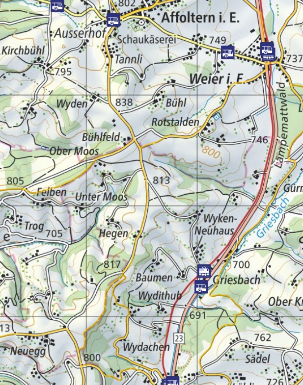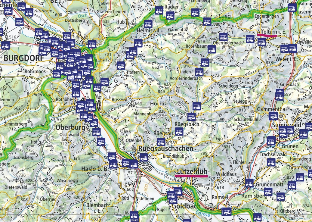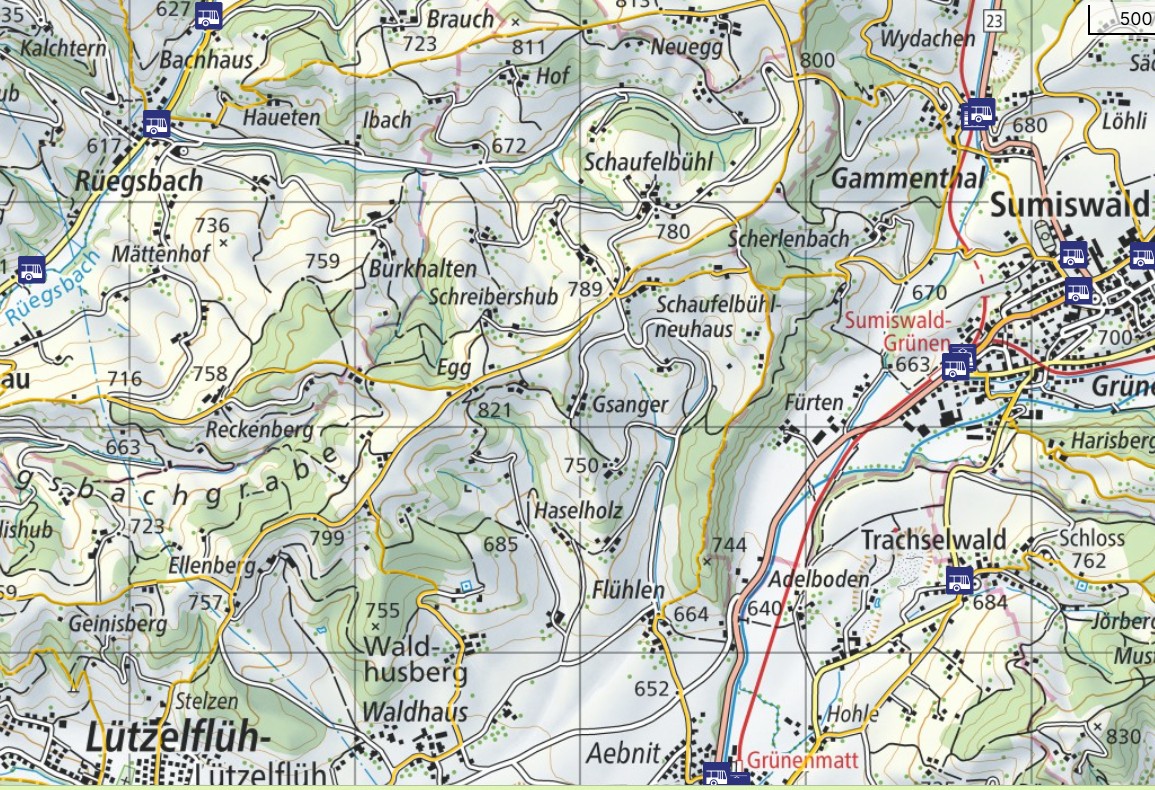 まずはLützelflüh(地図左下)から北東へ。Lützelflühを経由した鉄道が北上したのが東側に、また西側にはバス路線が通ってますが、