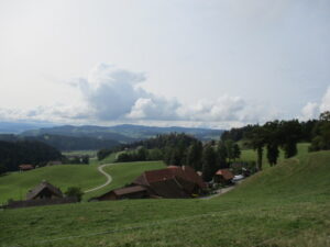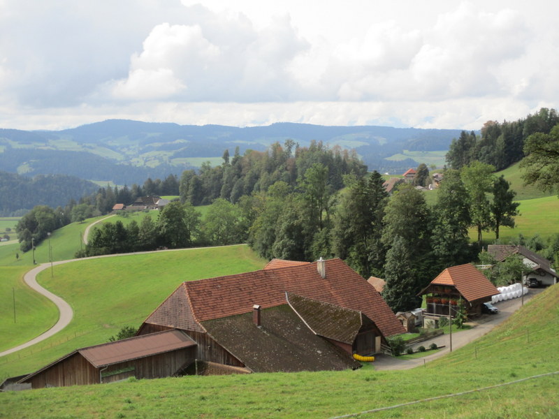 前回の濃霧の中の畑作地帯はベルンの少し西側部分でしたが、今回からはベルンの東側、エメンタール地方を歩きます。ベルンの北東の中核市Burgdorf(ブルグドルフ)、ここからEmme(エンメ)川沿いを南東にさかのぼってLützelflüh(ルツェルフルー)。チーズの名で聴いた覚えのあるエメンタールとはEmme川流域に広がる丘陵地帯です。Lützelflühから北のAffotern、そこから西へHeimiswillまで歩きました。