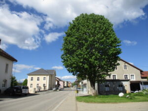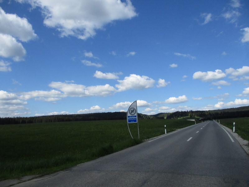先ほどの黄色の表示板のすぐ横に、家の間を上って行くよう例の黄色のハイキング表示があったので、ほぼ国境線に沿う形で上って振り返ったところ。