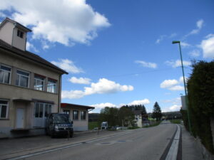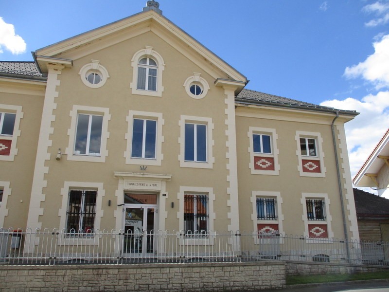 街道沿いに家が連なる街道町Aubersonの中心部、パン屋の前から一本道を西にどんどん歩きます。学校発見。