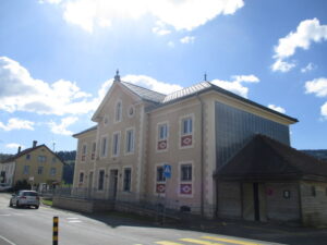 オルゴール製作所の文字が壁に残る建物。Ste-CroixからL’Aubersonにかけてはタイプライター、時計、カメラ、オルゴール等の精密機械製作所が多くありました。