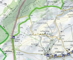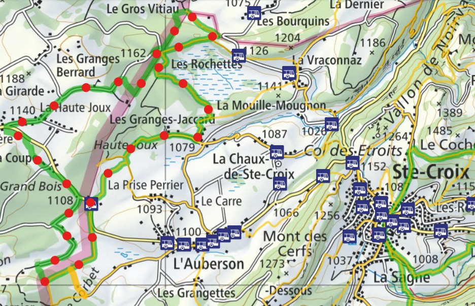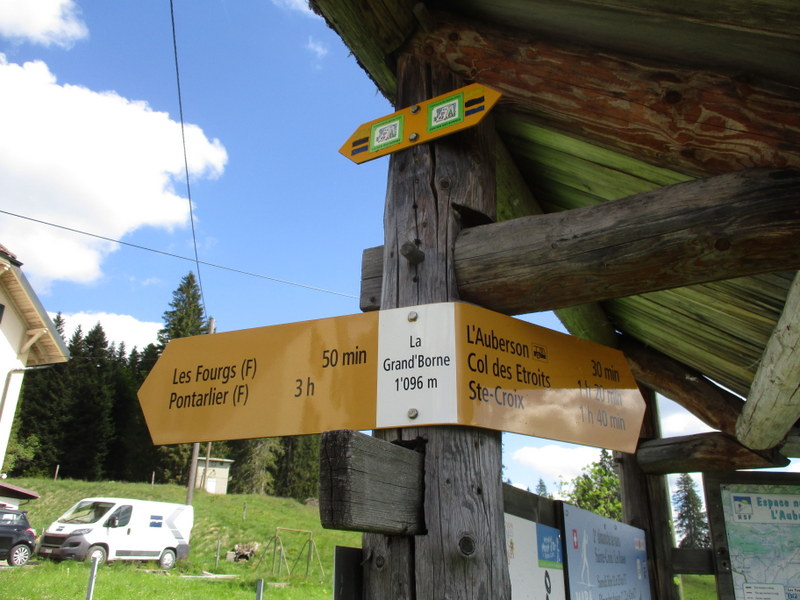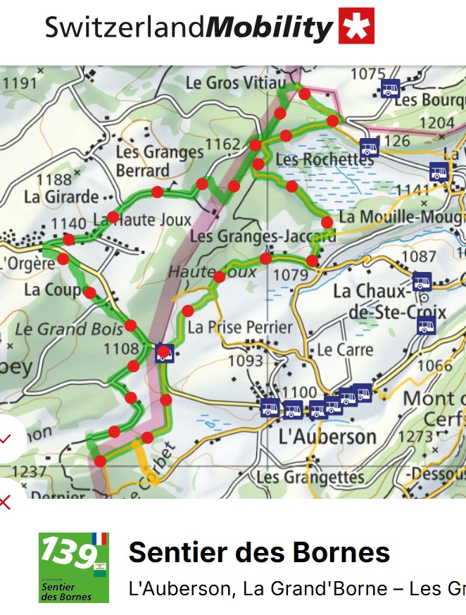L’Aubersonまでのバスの本数は多くはありませんが、数年前までに比べると平日・週末共に運行が確定し、便利になりました。地図ではスタート地点の国境・Grande Borneにバス停マークが付いてますが、普段はここまでバスが来ることは無く、Aubersonの町中までです。ここにはイートインスペース付きのパン屋が2軒!半年前には1軒だったのに増えてる!素晴らしい!営業時間等を事前に確認することをお勧めします。なにせ、この先は飲食店が限られるので。