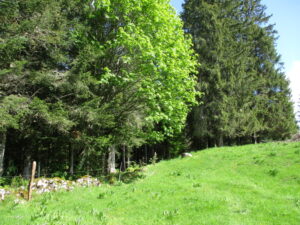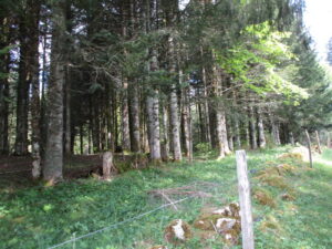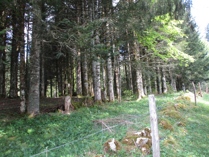 国境線沿いに歩き続けても、その先でSentier des Bornesにちゃんと合流でき、こちらの方が面白そうだったと今は思いますが、地図上の指示に従い、国境線から離れ、不明瞭な道を探しました(草地の真ん中でなんとか発見)