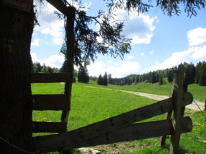 上った先で国境に出たはよいが、地図だとハイキング道の表示がある、北西方向への国境線沿いの道が分からない。仕方がないので、南方向への国境線沿い(写真では柵沿い)へ。