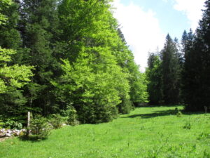 地図に標高1111mとある所。ここから斜面を上ると国境に出ます。
