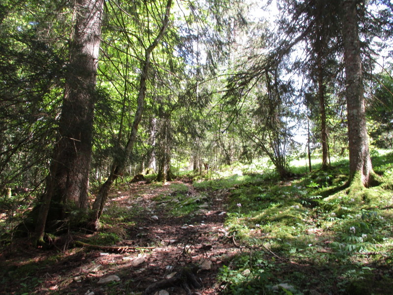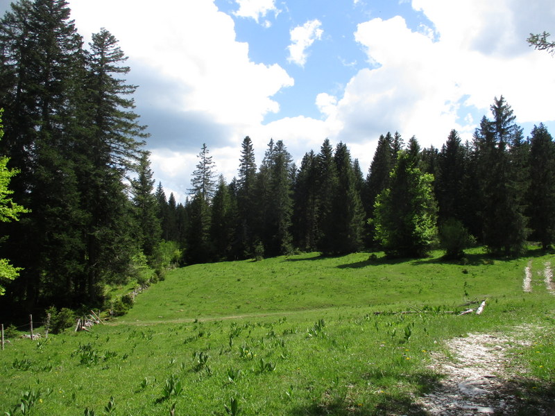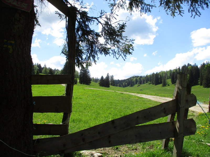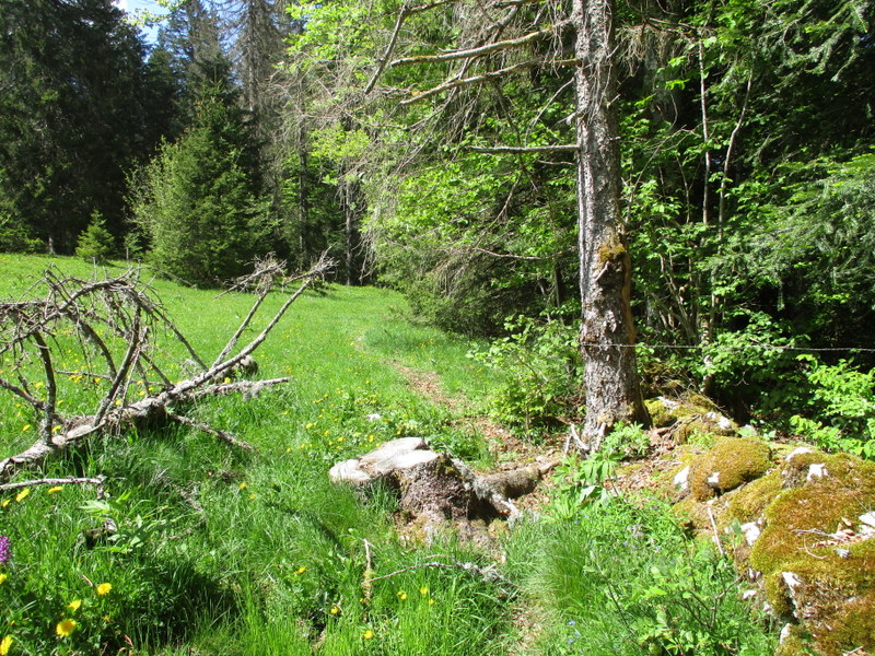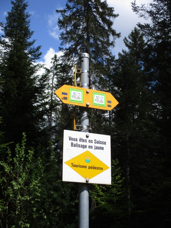 「貴方はスイスに入りました」、と黄色のハイキング道の表示。なぜかSentier des Bornesの緑のマークも付いてきた。コースから外れたと思ったのだが、よく分からん!多分、コースって一旦決めたら不変なわけでなく、それなりに変更があるからだと思う。