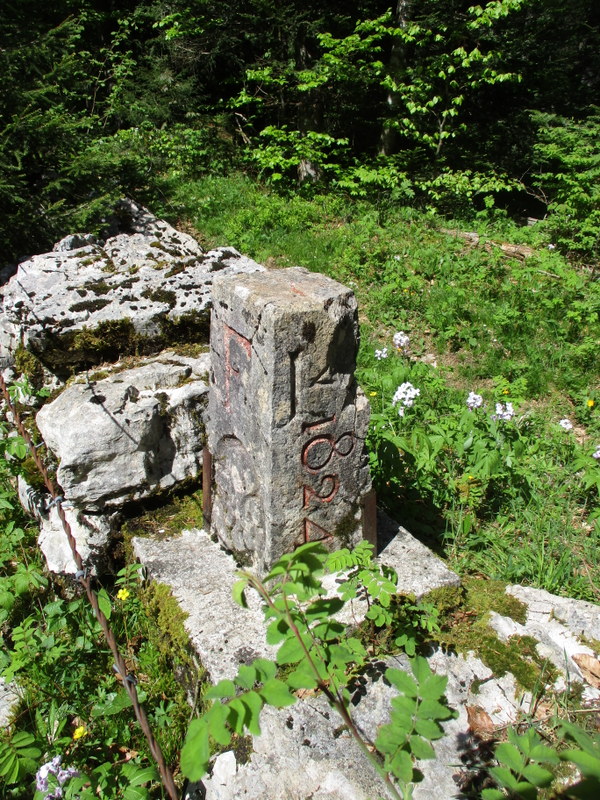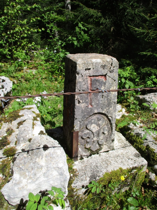 国境石。百合の花にFの文字。確かに今いるこちら側はフランス側。