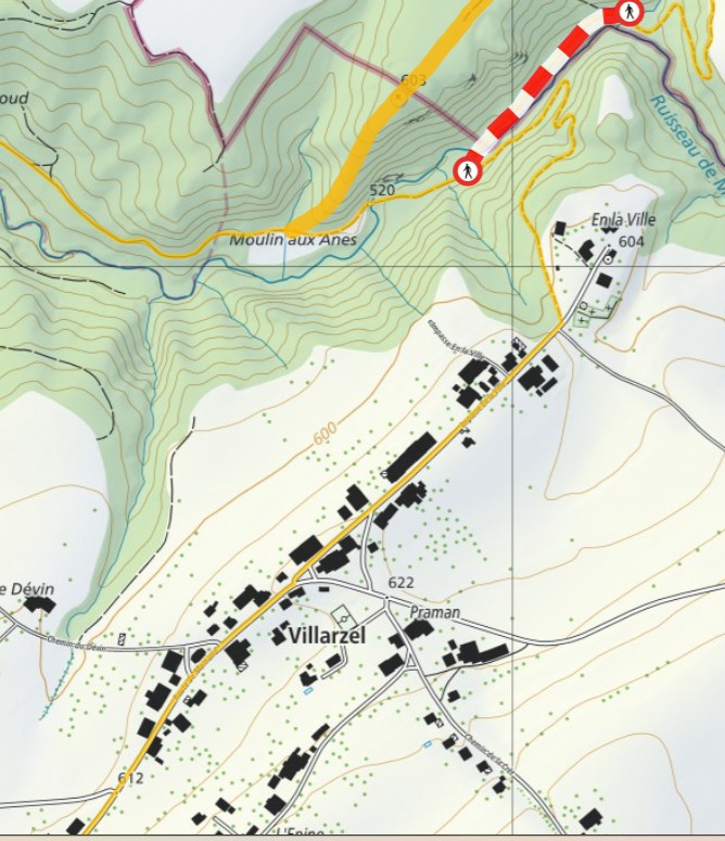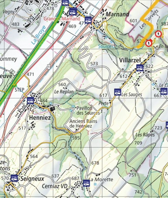 Henniezの町の東にある谷沿いの森には「Anciens Bains」と書かれており(最初の地図)、温泉?の跡があったのかと思いましたが特に何も発見できず。Henniezはミネラルウォーターで名が知られており、Pavillons des sources(源泉)の表記も地図上にありますが、こちらも特に分からないまま通り過ぎました。