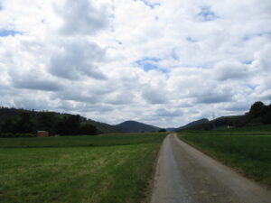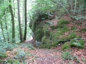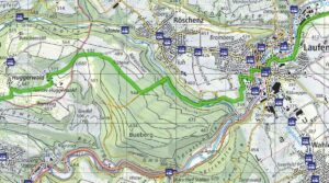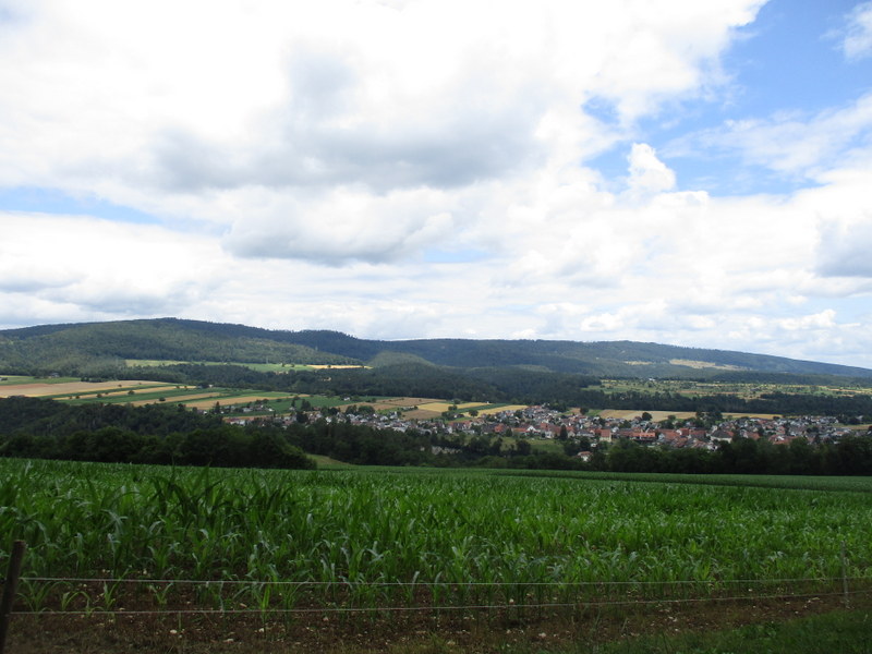 150mほど登り、北側に開けた所に出ました。下方にLützel川が平行に流れ、川を挟んで対岸にRöschenzの町。
